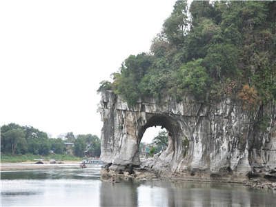 象鼻山は桂林市市內の桃花江と漓江の交差所に位置し、巨大の象が鼻を伸ばし、水を飲んでいるような姿に見えるため、その名を付けた。桂林山水のシンボルと言われ、海抜は200m、水面からの高さは55m、長さ108m、幅の広さ100m。山の面積は1.3萬㎡、3.6億年前の海低沈積巖から構成した。1986年象鼻山を主に象山公園を作って、園內は自然山水と人文景観が互いに融合している。重要な景勝とは水月洞、象眼巖、普賢塔、宏峰寺と寺內の太平天國革命遺址などがある。