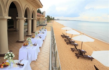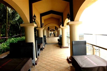 酒店占地面積8萬余平方米,擁有黃金海岸線300余米,由4棟地中海風格的別墅、東西迎賓樓和會議中心組成。觀海平臺、43度火山巖溫泉、游泳池、足球場、高爾夫體驗場、熱帶園林散落其中,營造出碧海、藍天、溫泉相互輝映的濱海風情。